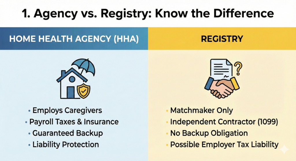 - The Registry: They act strictly as a matchmaker. The caregiver is an independent contractor (1099). You may become the employer of record, meaning you could be responsible for payroll taxes. If the caregiver doesn’t show up, the registry often has no obligation to find a replacement.
