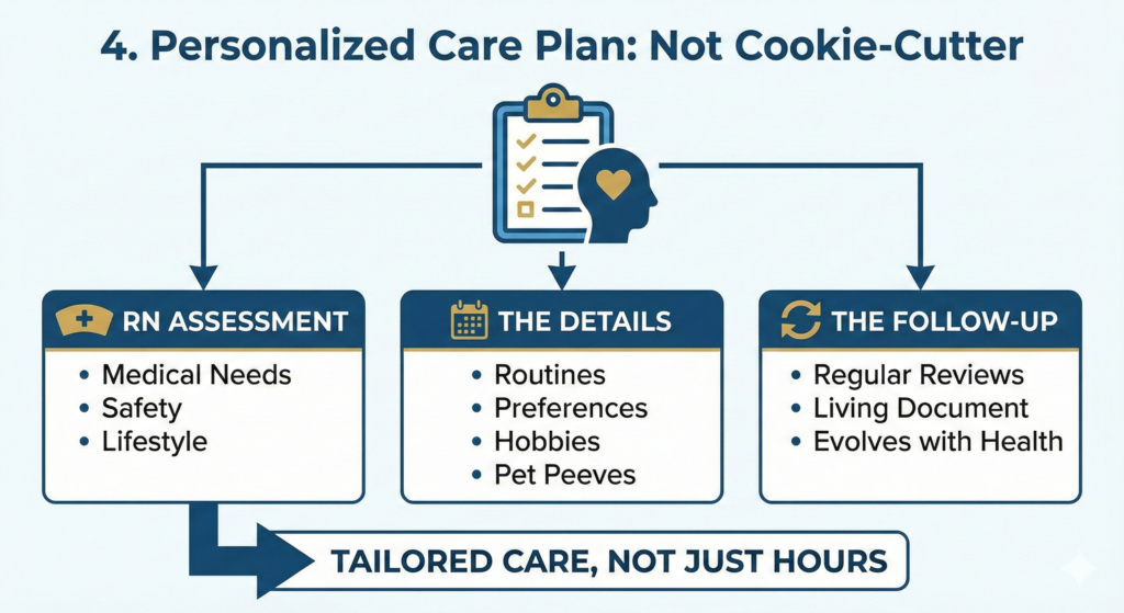 - The Assessment: A Registered Nurse or Care Coordinator should come to the home for a free assessment before service starts. They should ask about medical needs, but also about lifestyle.