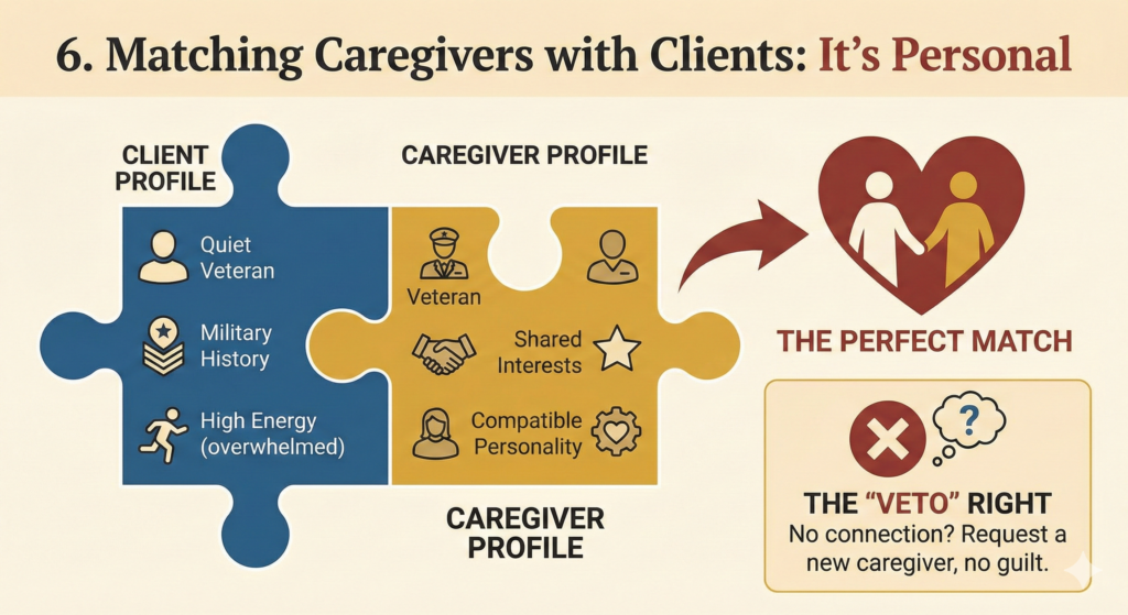 - The “Match”: Ask if they consider personality and interests. If your dad is a quiet veteran who loves military history, a loud, high-energy student might overwhelm him. A caregiver who is also a veteran might be a perfect match.