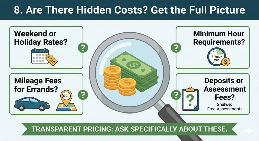 - Minimum hour requirements: “Do you require a 4-hour minimum per visit?” (This is common in the industry to ensure caregivers earn a living wage).