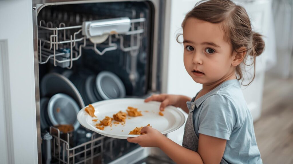 - Bathroom Routines: A laminated checklist is taped to the bathroom mirror with pictures showing: 1. Toothbrush with paste, 2. Brushing teeth, 3. Spitting, 4. Rinsing brush.
