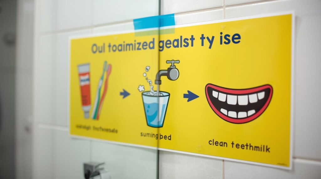 - Bathroom Routines: A laminated checklist is taped to the bathroom mirror with pictures showing: 1. Toothbrush with paste, 2. Brushing teeth, 3. Spitting, 4. Rinsing brush.