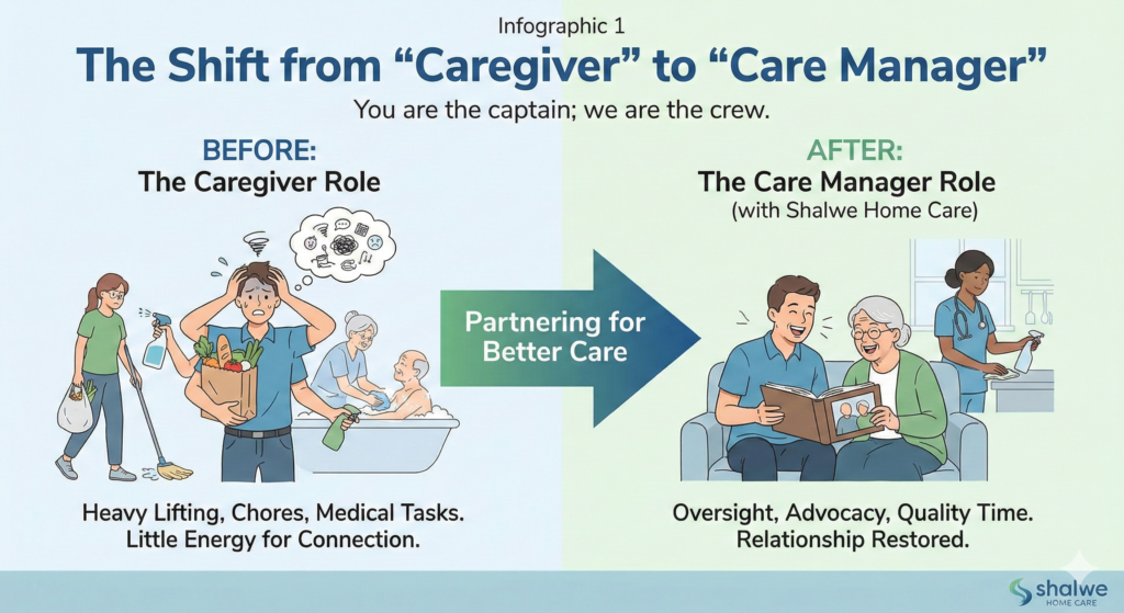 When Shal We Home Care in, your role shifts. You become the Care Manager. You are still the captain of the ship; we are the crew sailing it.