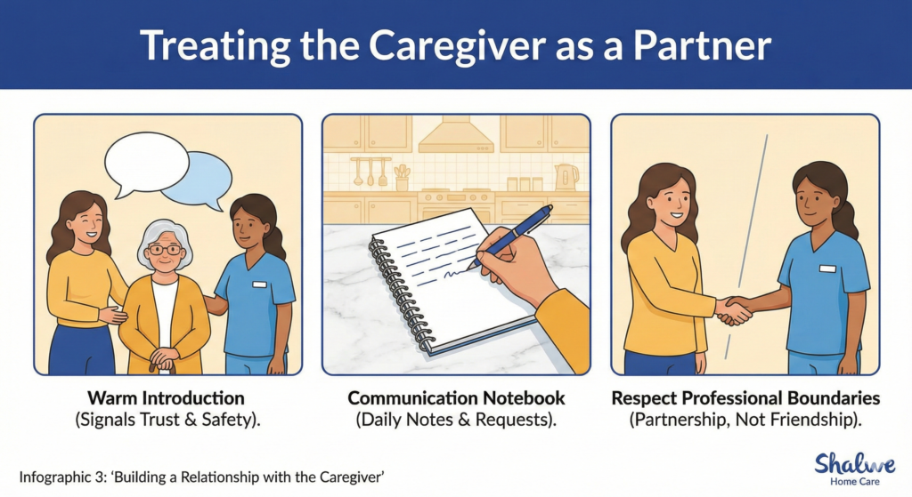 - The Introduction: If possible, be present for the first visit. Introduce the caregiver to your parent warmly. Your acceptance signals to your parent that this person is safe and trusted.