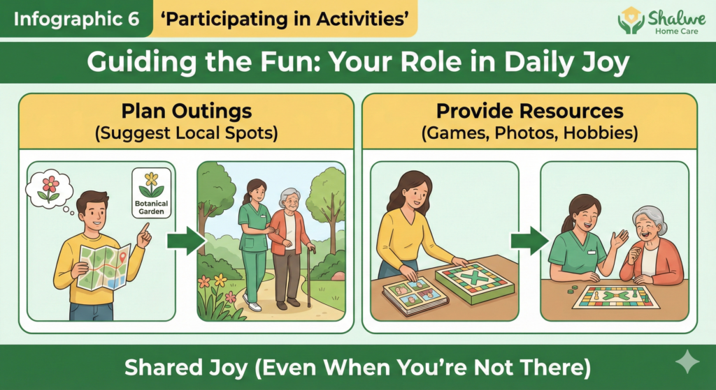 - Provide Resources: Leave out a favorite board game or a new photo album for the caregiver to use with your loved one. This guides the interaction in a way that you know your parent will enjoy.